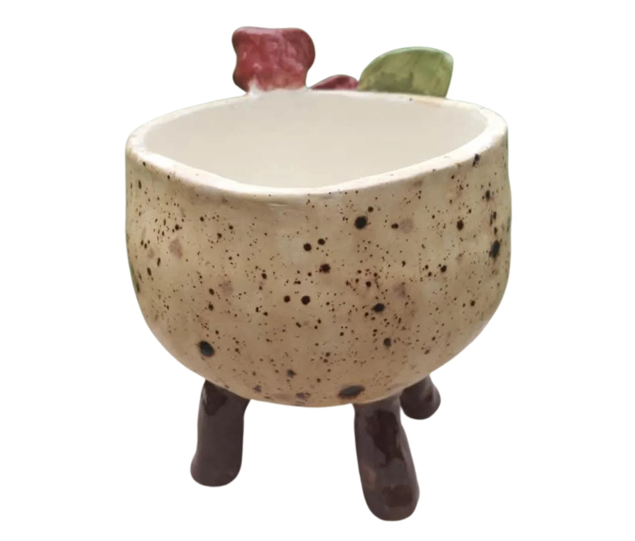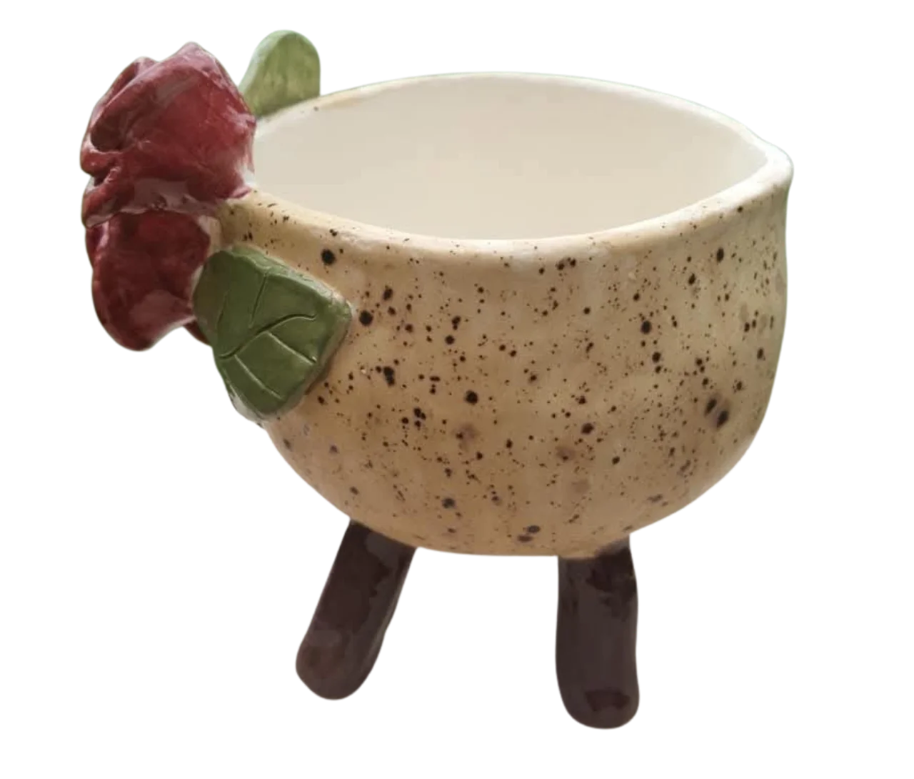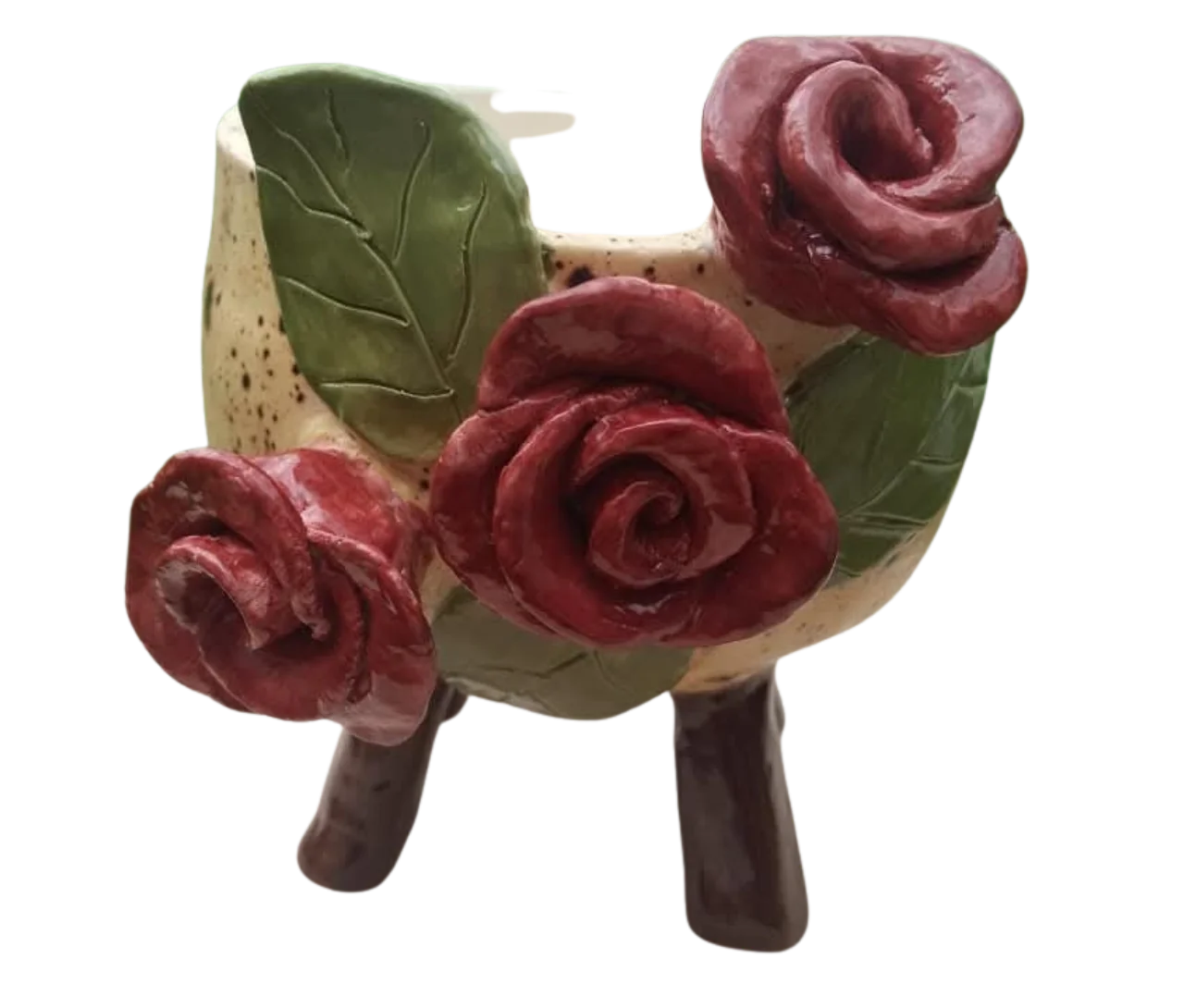 Maceta de cerámica con esmalte moteado y diseño en relieve de rosas rojas y hojas. Incluye patas de barro para elevar la pieza y destacar tu planta.
