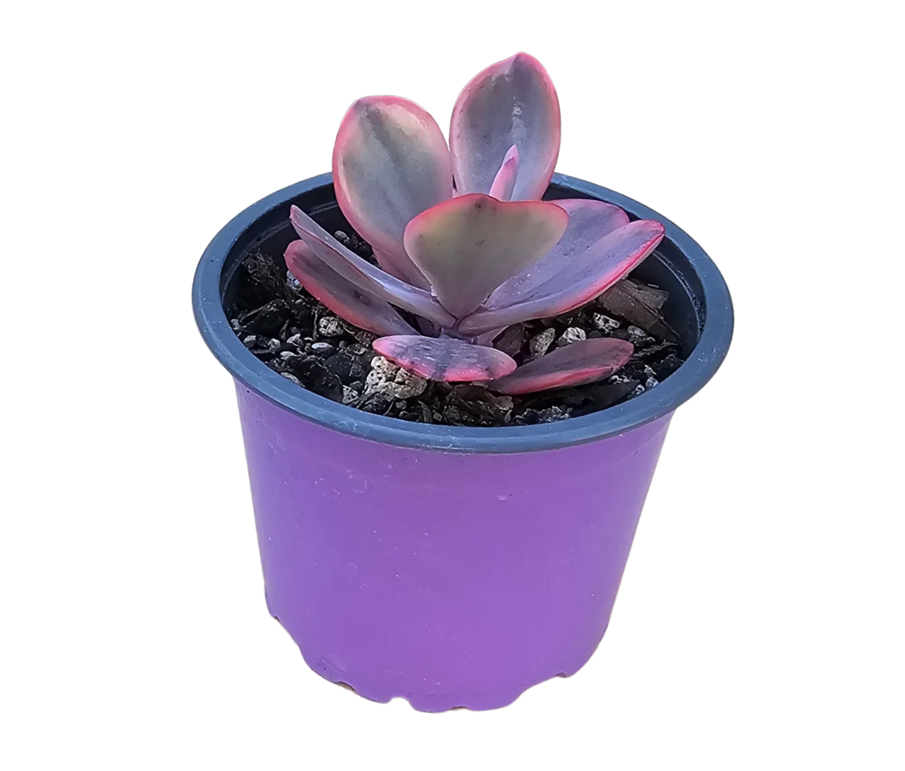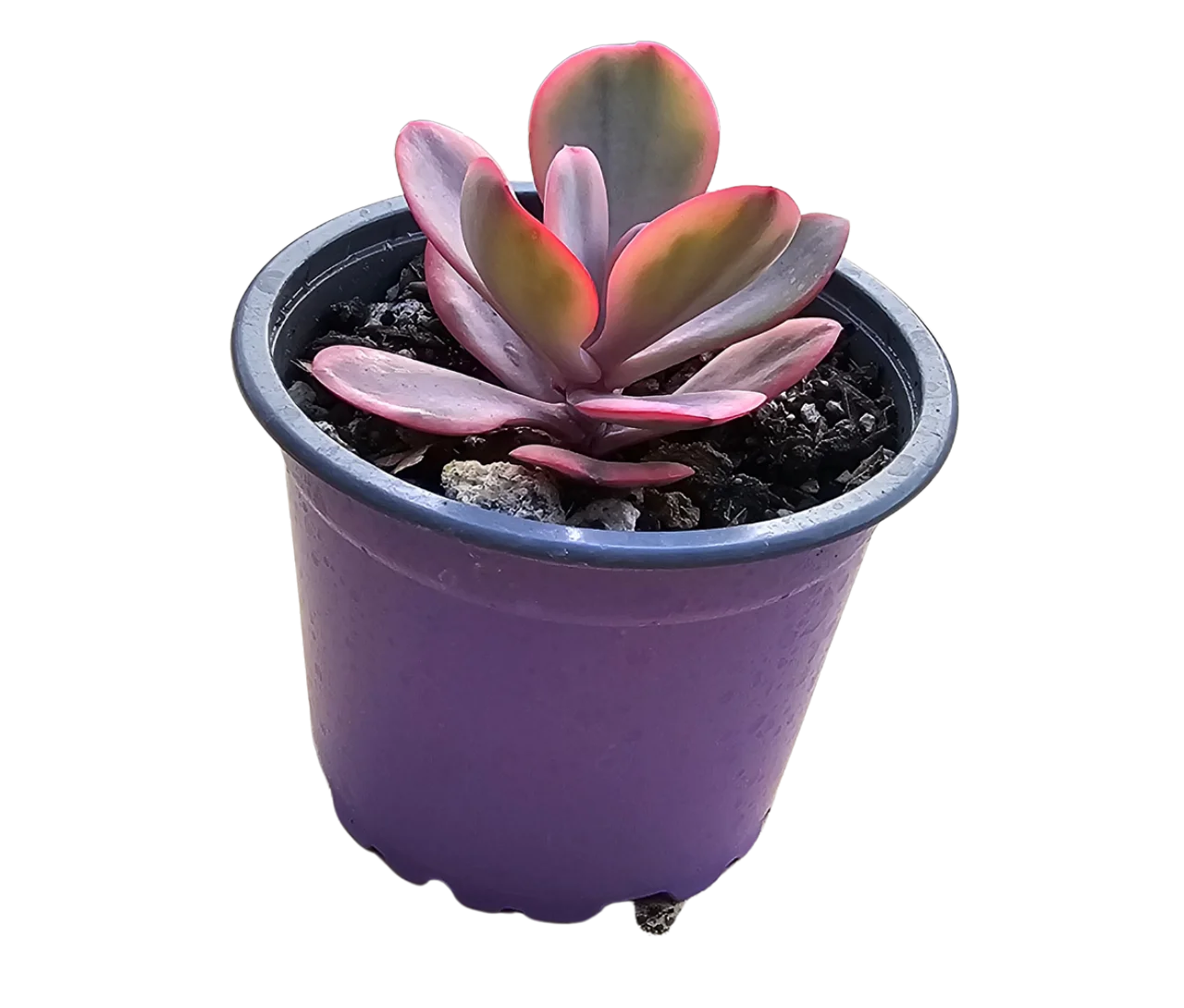 Delicadeza celestial. Una Echeveria ‘Angel Wings’ con hojas anchas que muestran una hermosa variegación en tonos verde pálido, rosa brillante y crema. Ideal para coleccionistas que buscan un color suave y único.